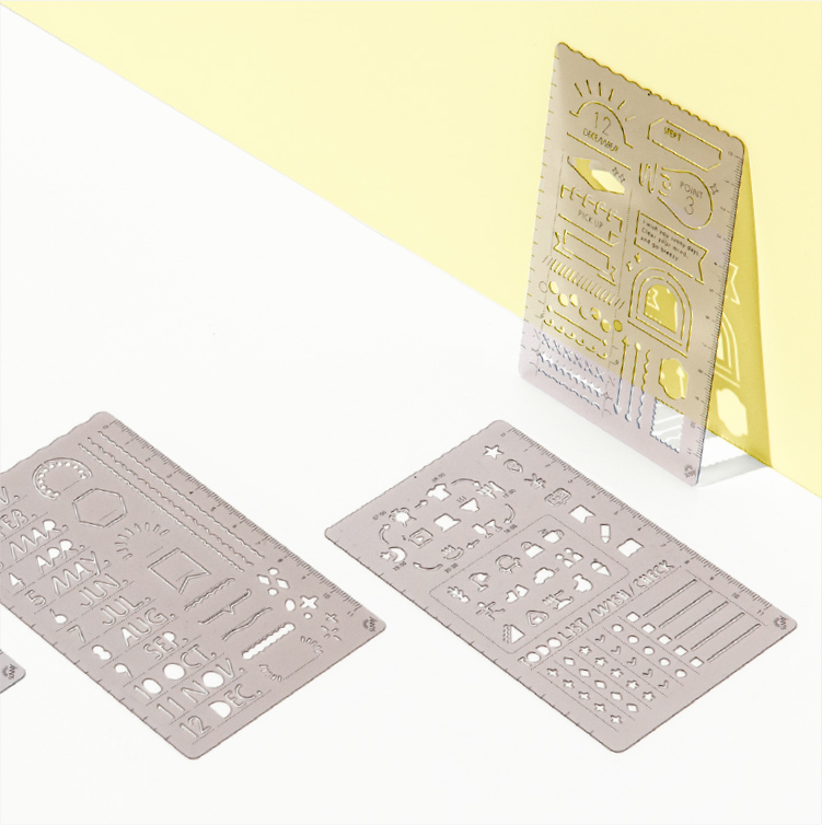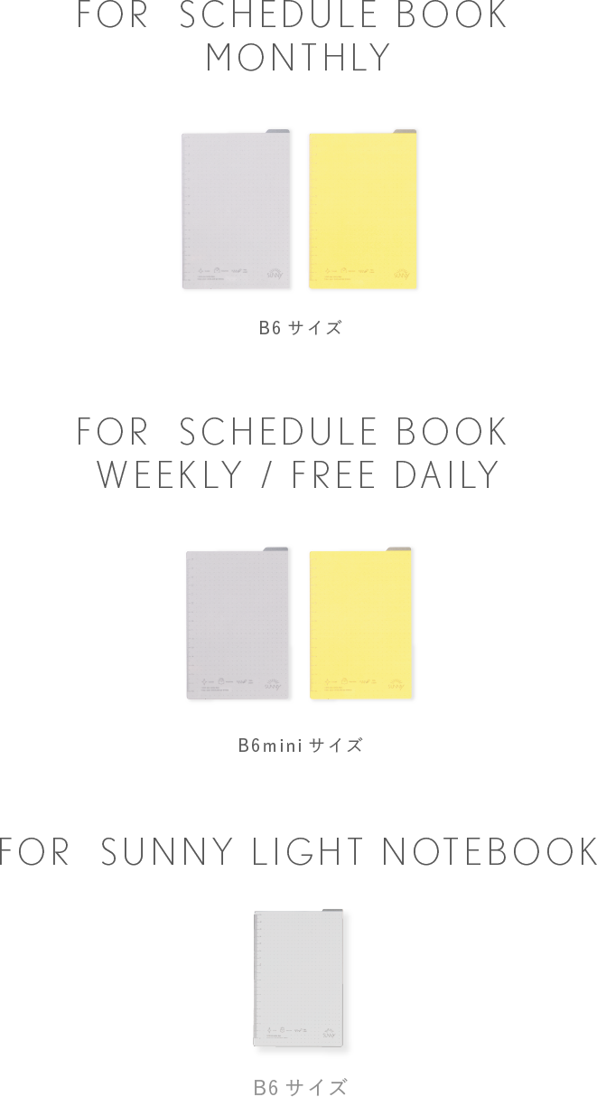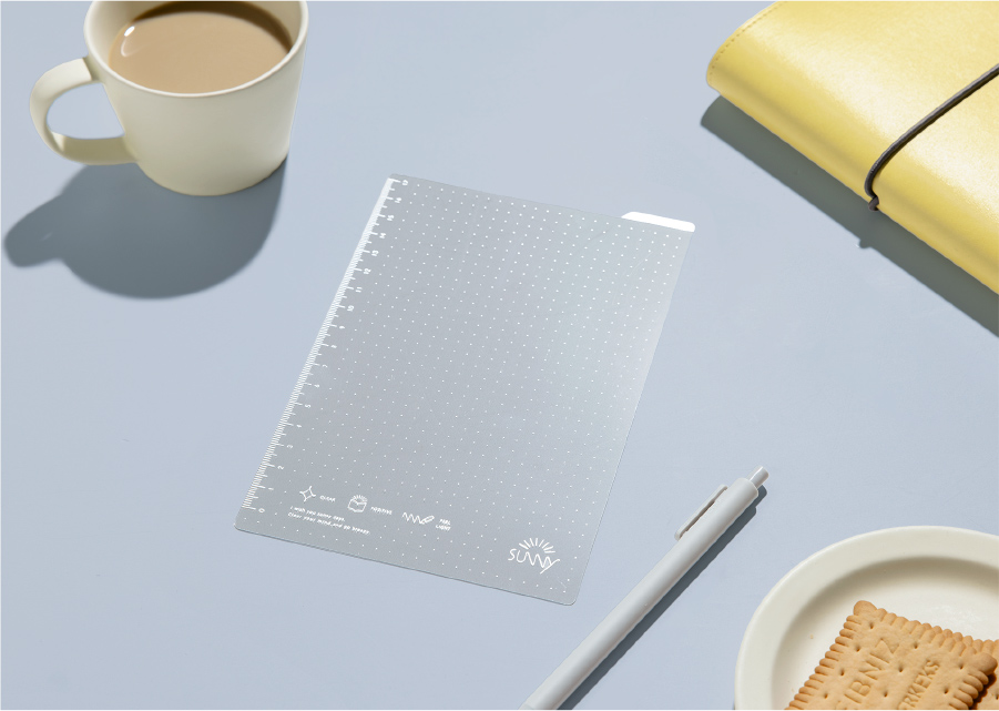 SUNNY手帳、ライトノートにぴったりのサイズの下敷き。いずれもクリア素材にシルバーの印刷でSUNNYらしいすっきりしたデザインです。上部にはしおりにもなるインデックス、側面には便利な定規付き。書き心地にこだわりたい方、筆圧の強い方におすすめです。