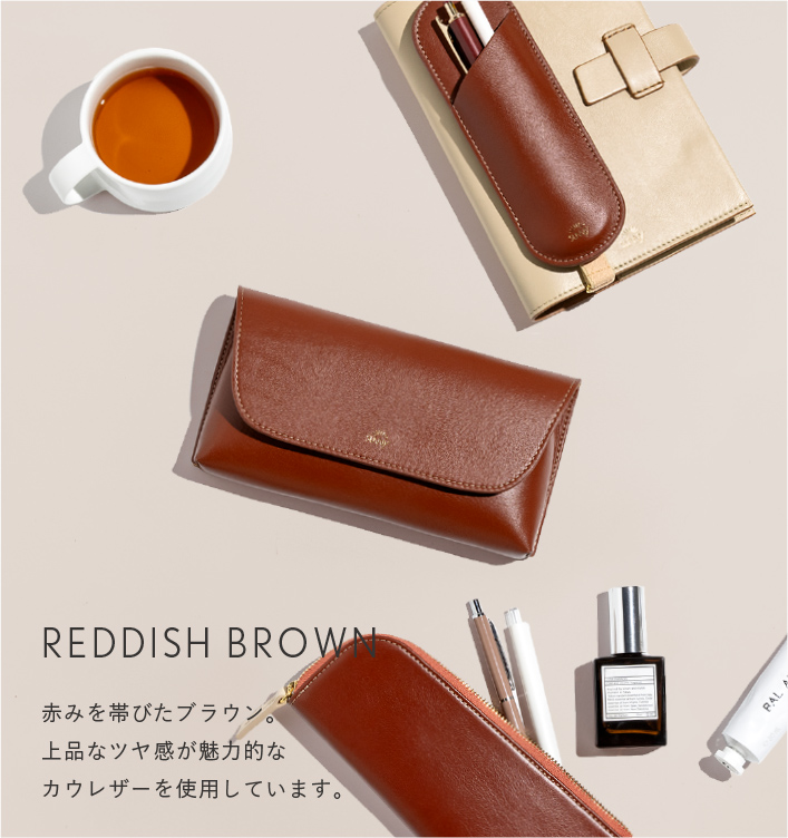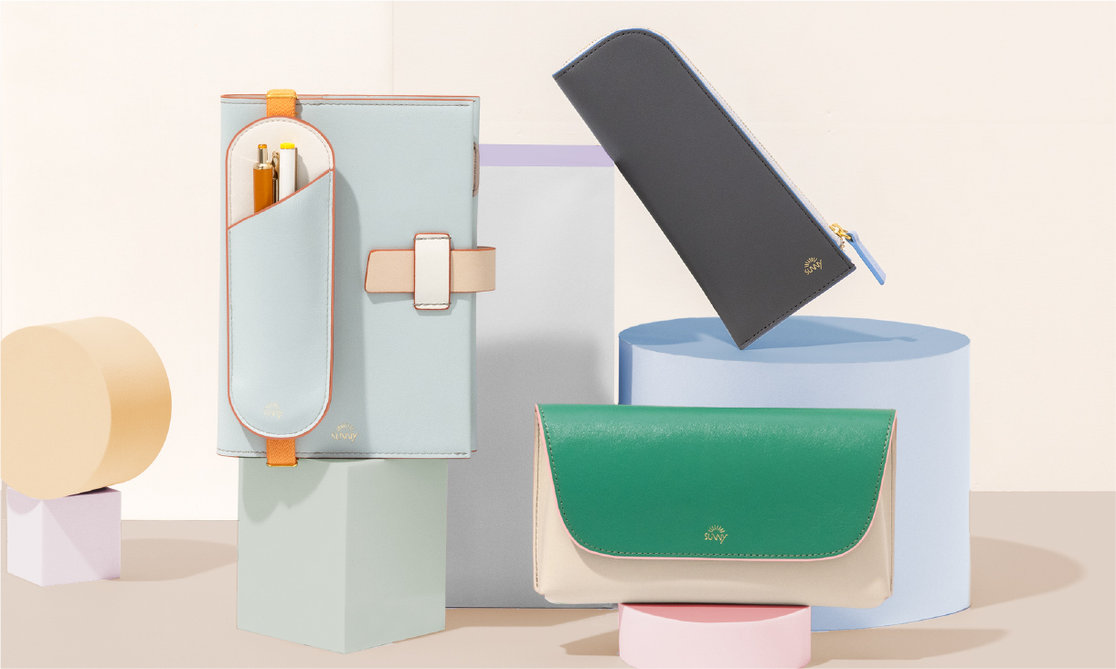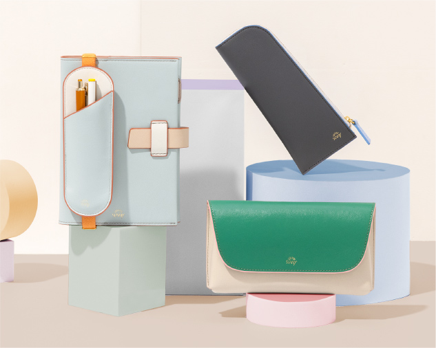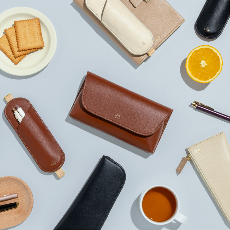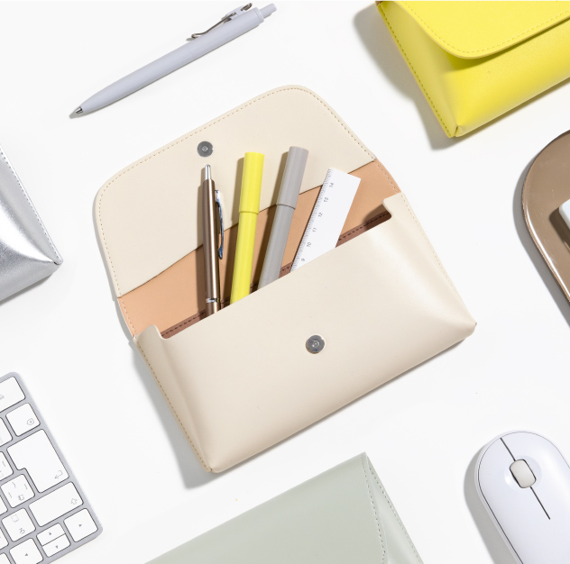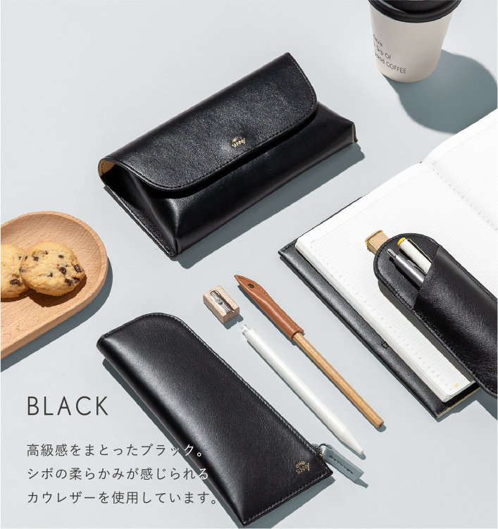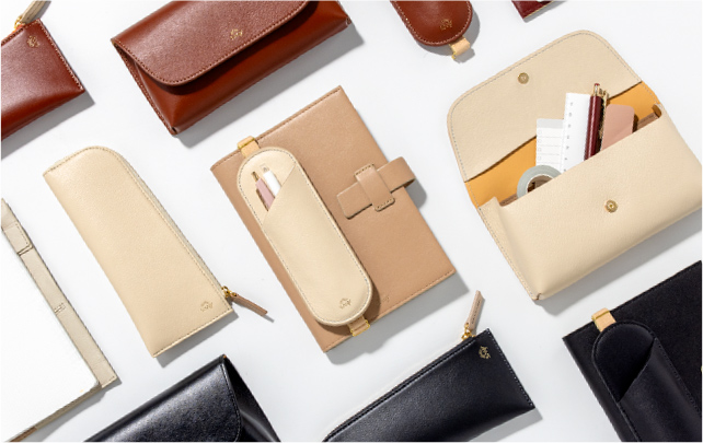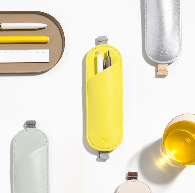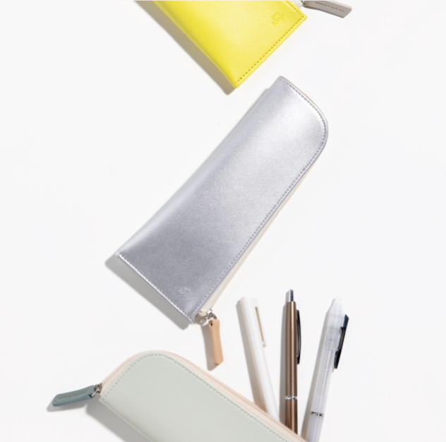 フラットで、手帳やノートと持ち運びやすい形状。 長さ調節できるブックバンド(ペンスリーブ)や、開閉しやすいL字ファスナー(ペンケース)、シールや付せんもすっきり収納できる内ポケット(ペンポーチ)など、使い心地を追求したデザインが、毎日の書く時間に寄り添います。