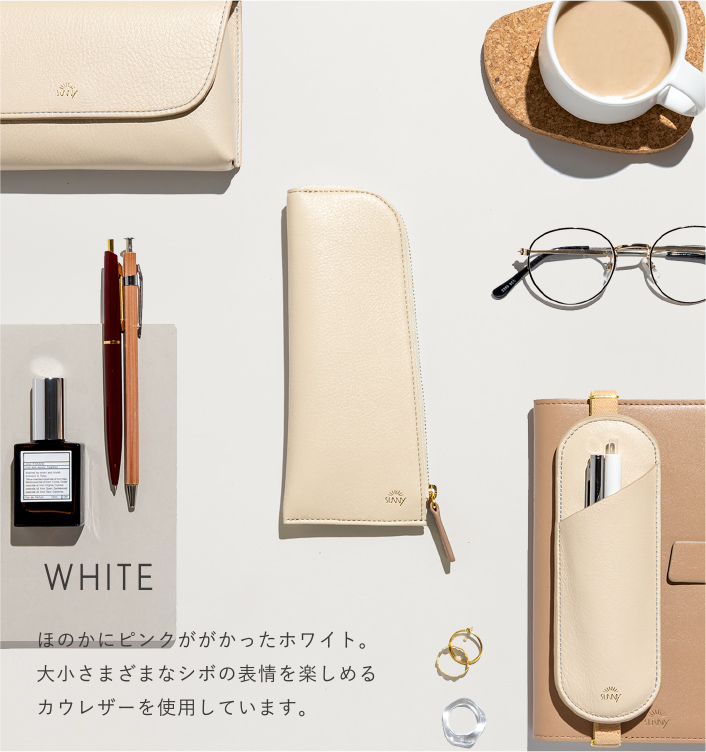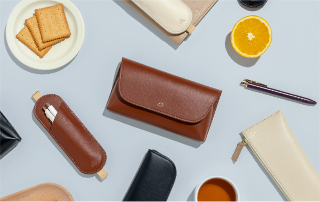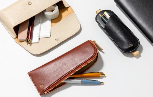 ペンスリーブ、ペンケースは、汚れに強いポリエステル素材を内生地として採用。より丈夫で軽量な仕上がりに。 ペンポーチは、薄手の本革を貼り合わせ。内生地に処理を施し、毛羽立ちを抑えられるよう工夫しました。