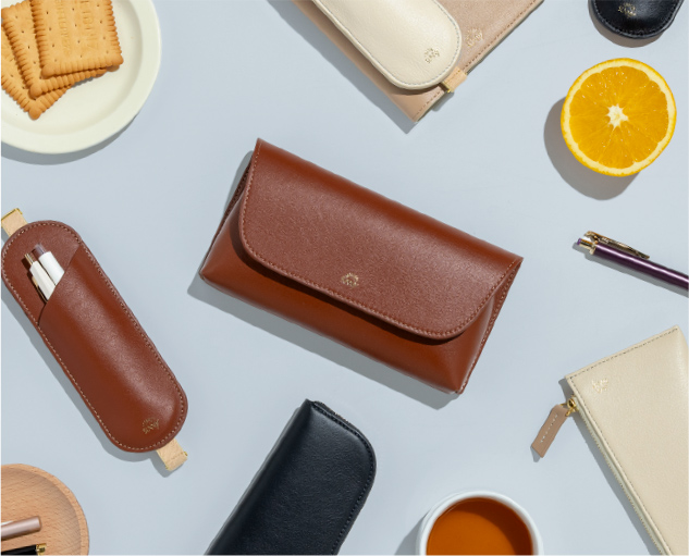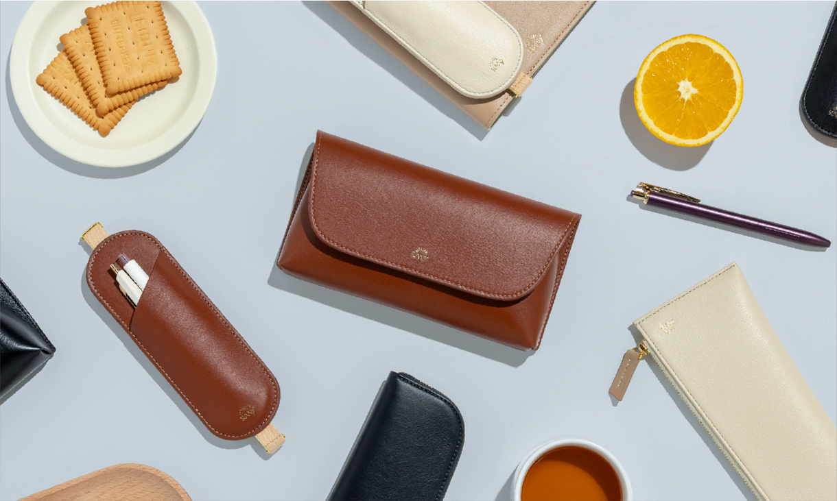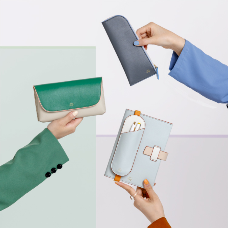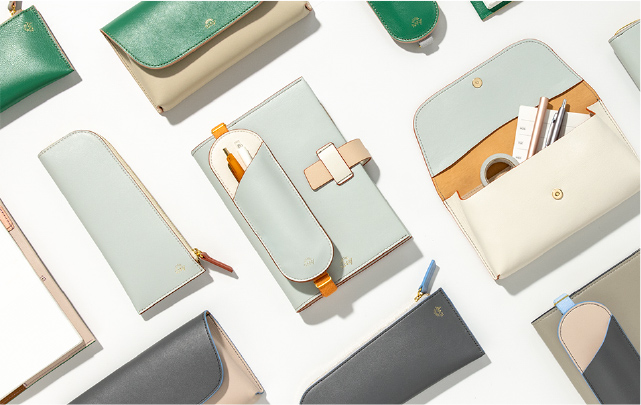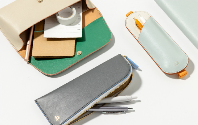 フラットで、手帳やノートと持ち運びやすい形状。 長さ調節できるブックバンド(ペンスリーブ)や、開閉しやすいL字ファスナー(ペンケース)、シールや付せんもすっきり収納できる内ポケット(ペンポーチ)など、使い心地を追求したデザインが、毎日の書く時間に寄り添います。