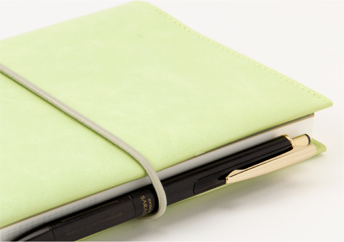 ペンが挟め、カバンの中でも手帳が開きづらく持ち運び時にも便利なゴムバンド。