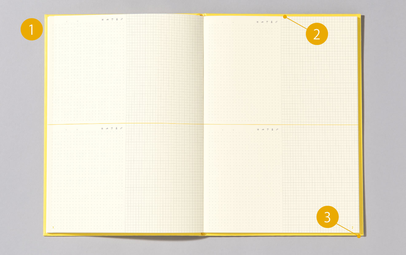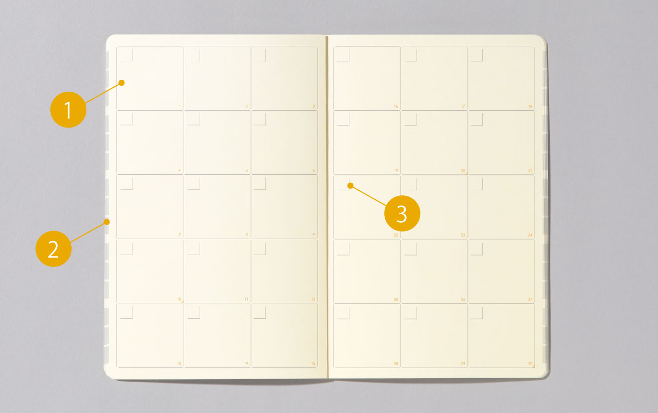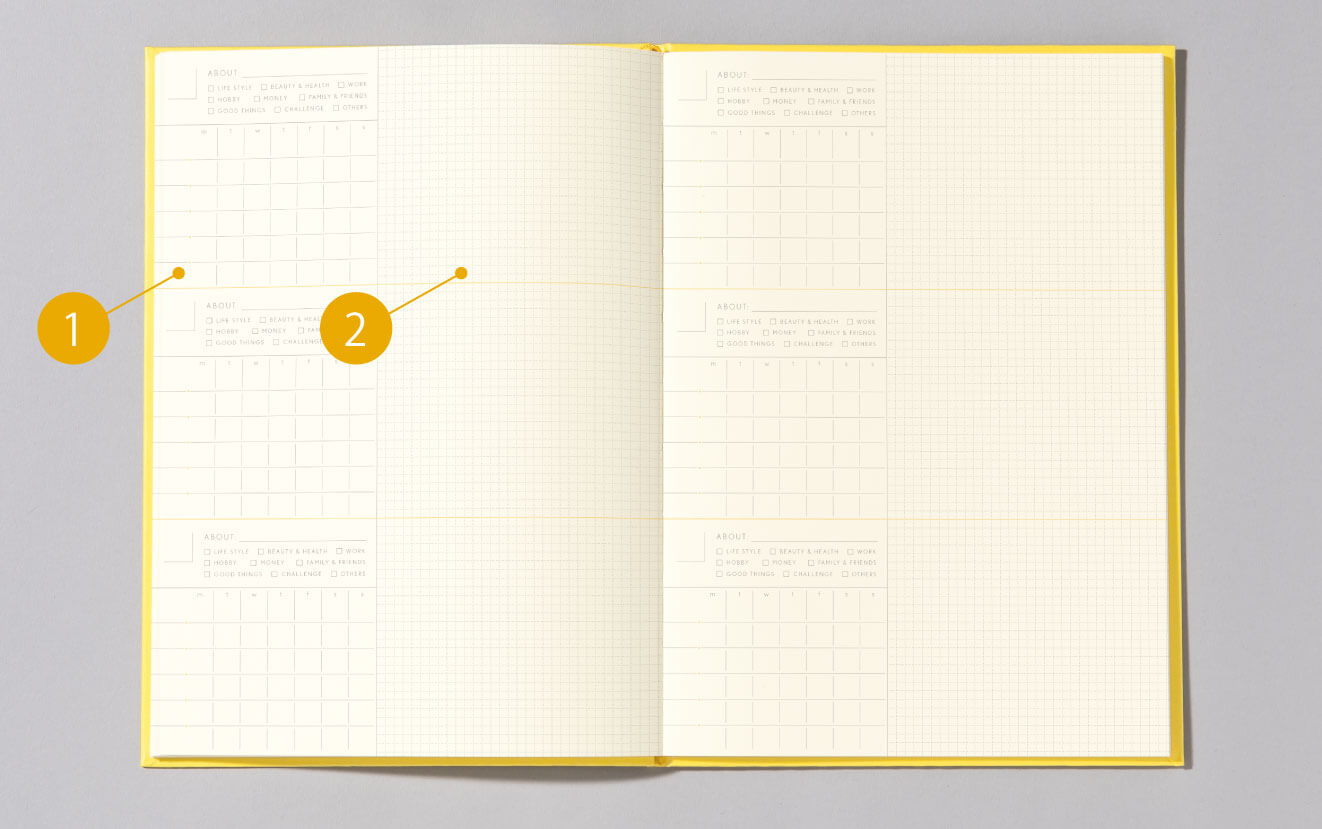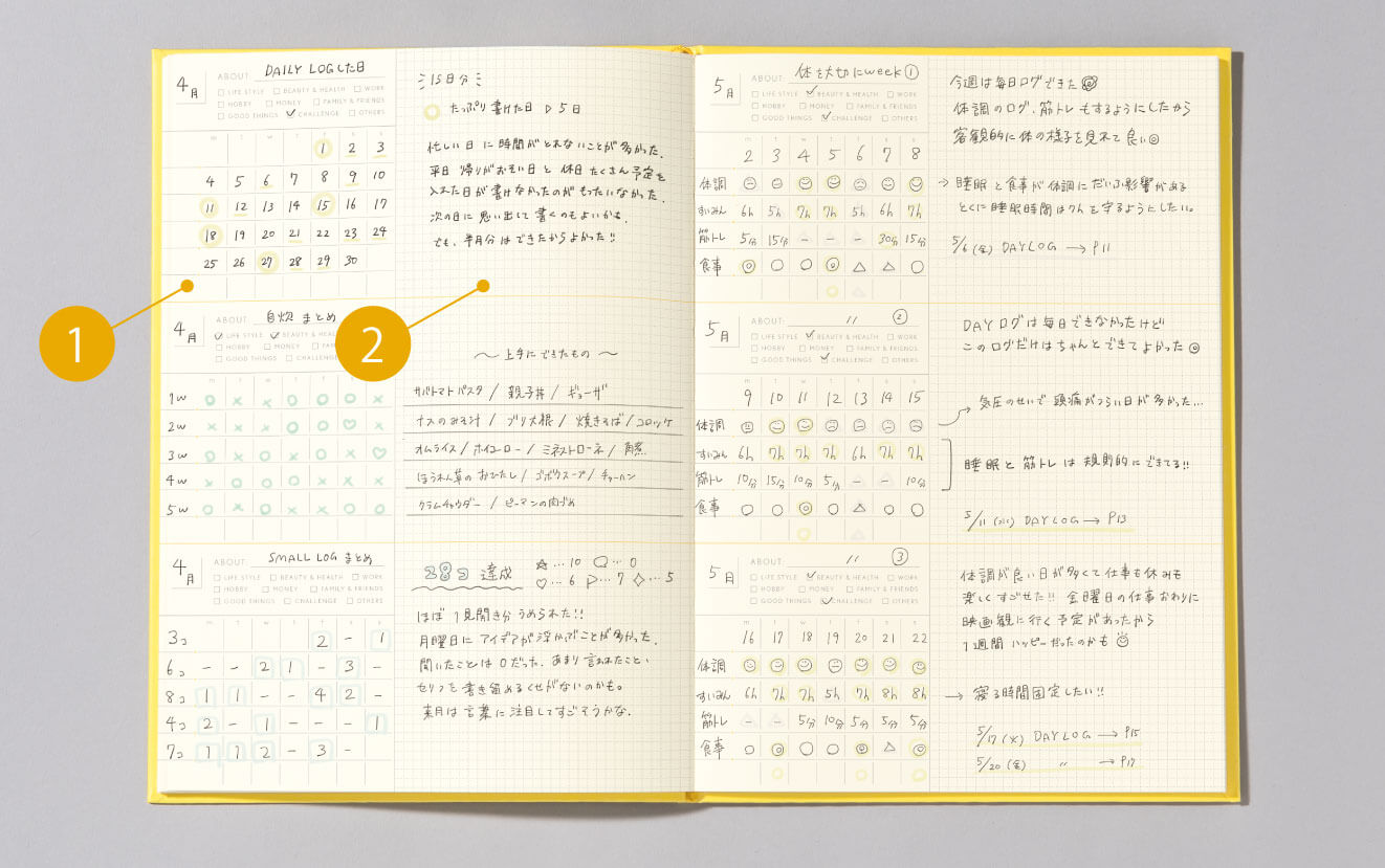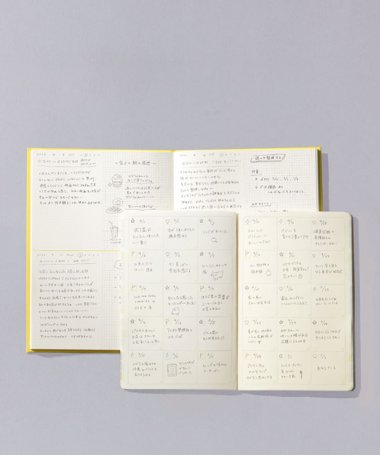 毎日書けるDAILY LOG と、1週間や1ヶ月単位で振り返りができるREVIEWING LOG を収録。しっかり開いて書きやすい糸かがり製本です。