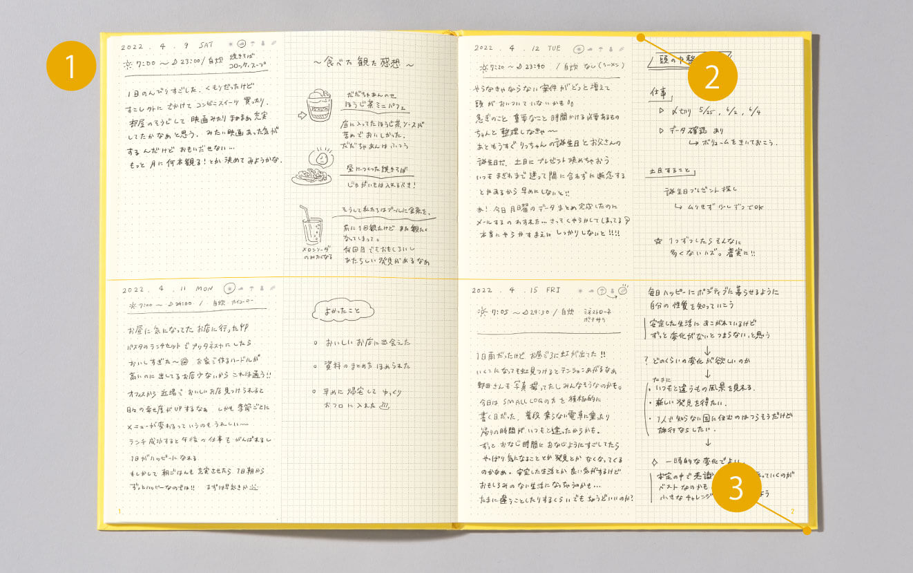 1日を2分割できるドットと方眼出来事+まとめや、日記+イラストなど、内容の書き分けがしやすいフォーマット。考えや気持ちの整理におすすめです。